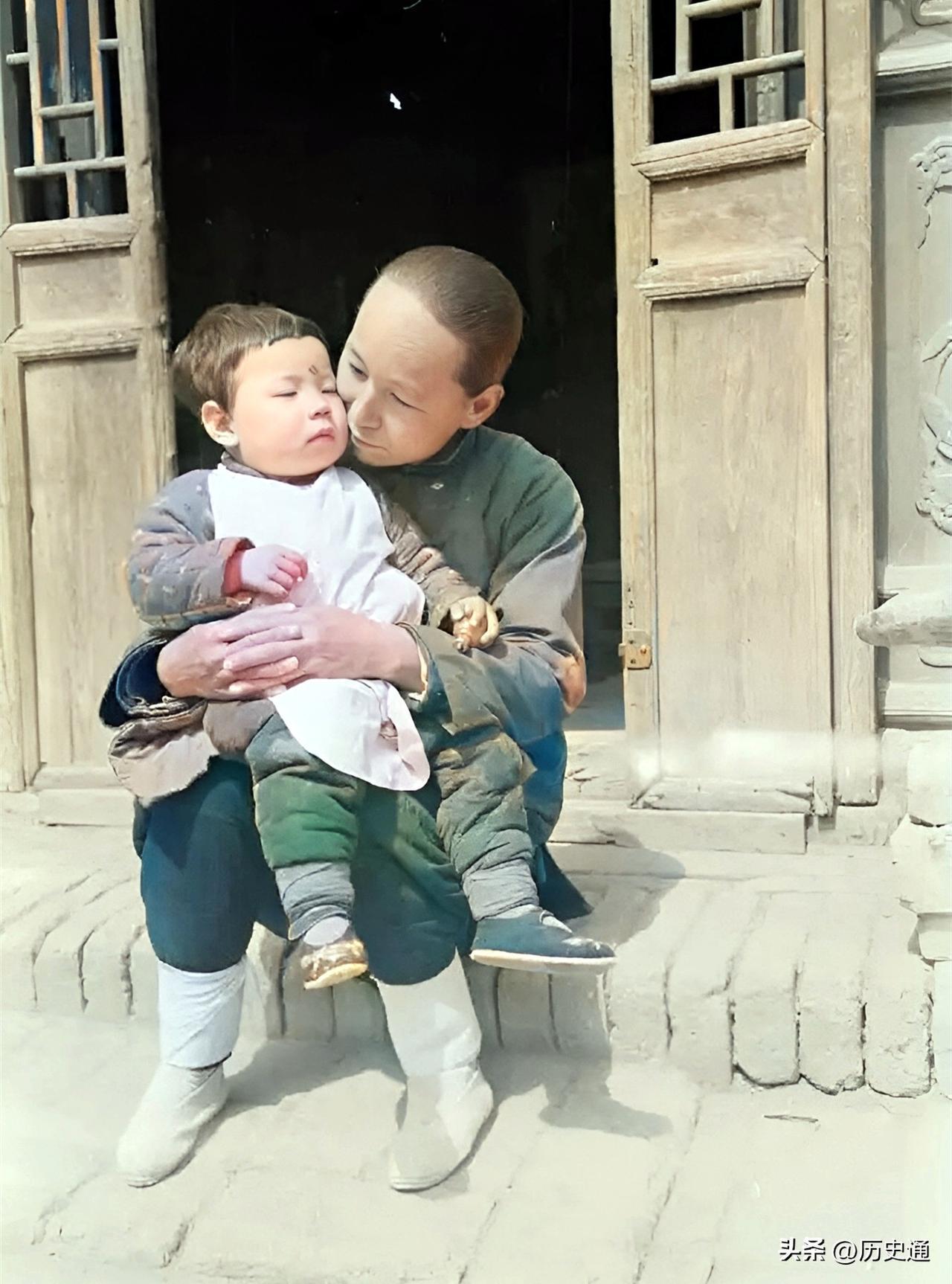 山西配资炒股 民国,河北一名地主婆抱着孩子坐在堂屋门前晒太阳。地主婆的双脚穿着白鞋