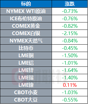 COMEX黄金期货跌0.82%,报3694美元/盎司;COMEX白银期货跌2.15%,报41.99美元/盎司。