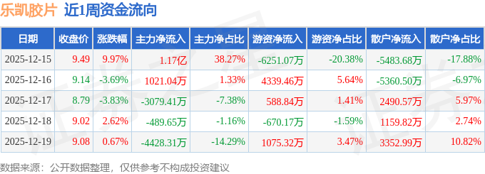 资金流向数据方面,本周乐凯胶片主力资金合计净流入4758.43万元,游资资金合计净流出917.62万元,散户资金合计净流出3840.81万元。本周资金流向一览见下表: